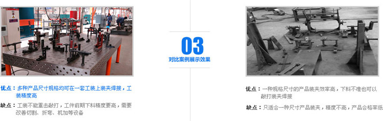 4、重复性:台面有铸铁/钢结构件/高精度加工件/模块化组件组合而成,其性能非常稳定,如使用不当造成部件损坏时,也不用报废整张台,只要非常少的成本就可以更换单个部件。焊接平台经过特殊加工处理,在焊接过程中,仅需低廉的防飞溅液即可免除工作台表面的焊接飞溅。